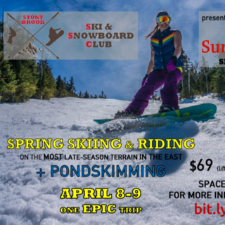 The Stony Brook Ski and Snowboard Club works to make skiing and snowboarding accessible (cost-wise and in terms of convenience) to any student who would like to try one or both of these incredibly fun winter sports. We're open to all levels of experience, from "never even been on a mountain" to "seasoned pro". During the warmer months, we fundraise for this purpose, and also organize other outdoor events for our members, such as mountain biking, climbing, camping, and hiking, to stay active and have fun.